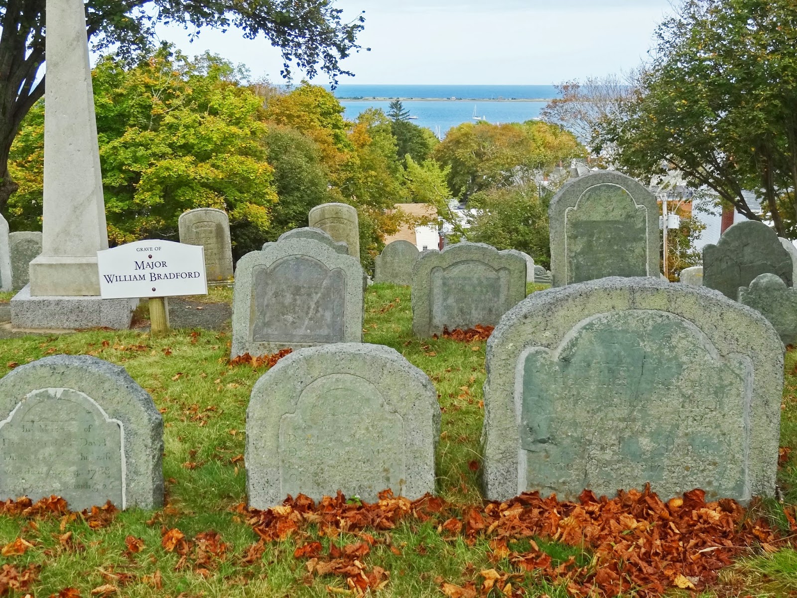 The final resting place for many former colonists overlooks downtown, Plymouth Harbor, and Cape Cod Bay in the distance. The marker of Major William Bradford is notable.
